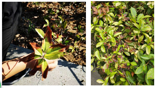 北方地區(qū)日照強(qiáng)度大,空氣濕度相對較較低,日灼現(xiàn)象十分明顯,紅葉石楠葉片邊緣受高溫影響大量失水導(dǎo)致葉片皺縮卷邊,開始枯黃,嚴(yán)重影響景觀效果。