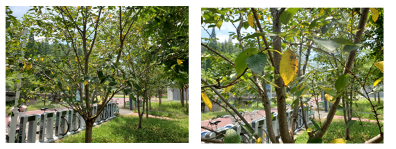 除此之外,筆者觀察到,長三角地區(qū)許多早櫻在受到高溫脅迫,出現(xiàn)樹勢衰弱、葉片枯黃的情況,各種病菌侵入,嚴(yán)重的出現(xiàn)了葉片穿孔。