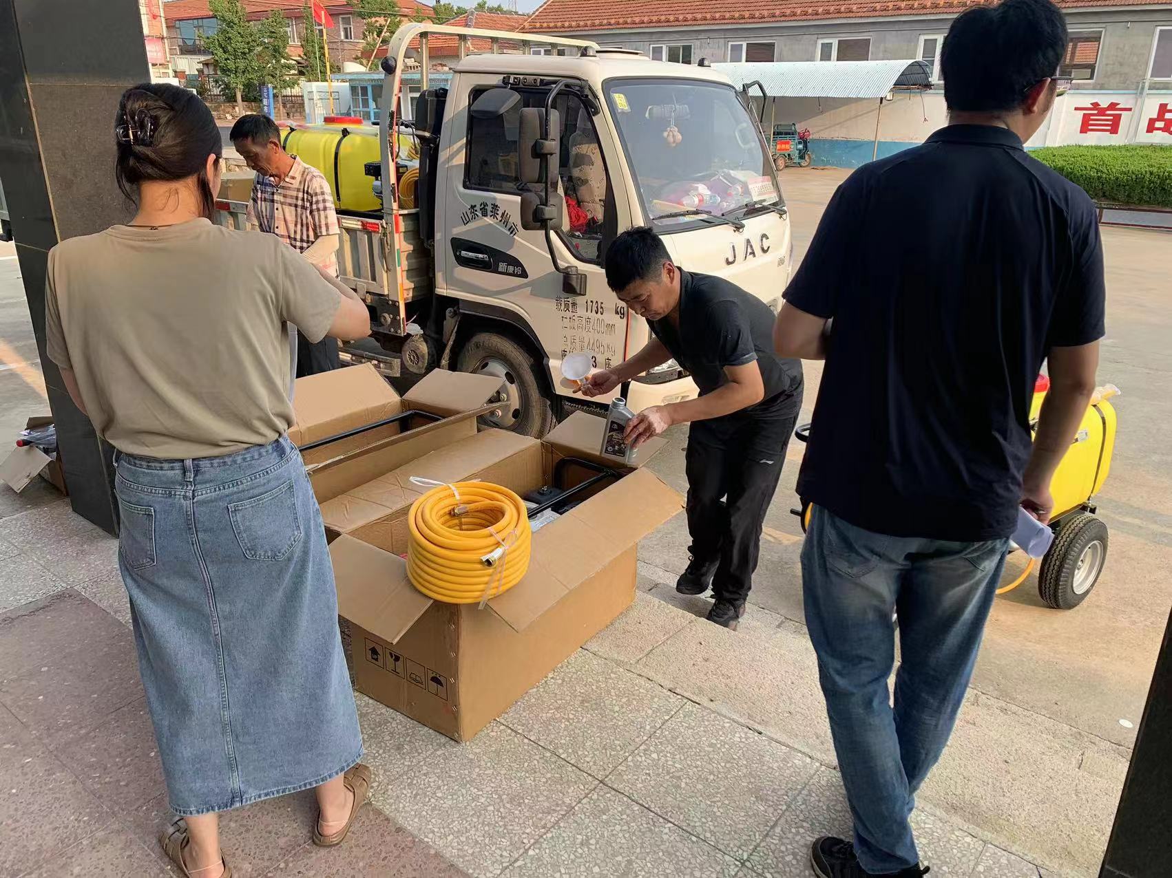 工具到貨,為盡快完成供貨,濰坊綠友的同事們一件件、一箱箱卸到庫房,根據(jù)每個(gè)鎮(zhèn)的需求,按型號(hào)按數(shù)量分裝、核對,為打藥機(jī)加注機(jī)油以便客戶使用。汗水模糊視線、打濕衣襟,卻毫不影響同事們的工作勁頭。