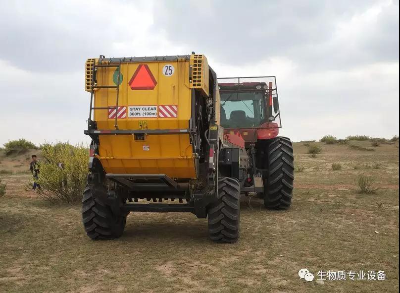 在為期4日的演示過程中,設(shè)備表現(xiàn)完美,超乎想象。在拖拉機(jī)的牽引下,一行行的檸條被設(shè)備吃進(jìn)肚子,消化一會便后拉出個大大的“金粑粑”。