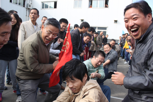 拔河比賽是最考驗團(tuán)隊凝聚力的項目了。裁判員一聲令下,所有的選手勁往一處使,勒緊麻繩不放松,在強(qiáng)有力的“1、2、3”的口號下,每個參賽者使出九牛二虎之力,把繩子往自家起點(diǎn)線邊拉。只見繩索中心的紅線忽而左忽而右,參賽選手們絲毫不放松,腿彎了、差點(diǎn)就坐在地上了,大家又一股力量地往回拉。圍觀的同事們急得直跺腳,嘴上喊著“加油、加油”,手還一直往一邊“推”,好像自己也在拉著比賽繩一樣。在這場力量與意志的比拼中,拓寶二、營銷二部、草坪灌溉聯(lián)合組奪得了最后的勝利。