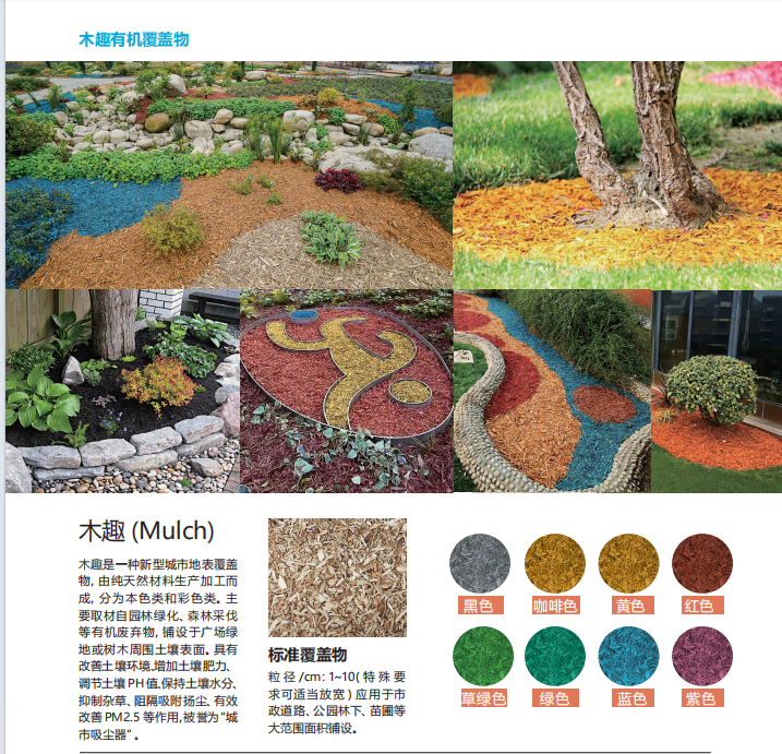 有機(jī)覆蓋物:是利用各種有機(jī)生物體材料,通過各種生產(chǎn)工藝,加工處理后鋪設(shè)于園藝植物或樹木周圍的土壤表面,起保持土壤水 分、吸附揚塵、調(diào)節(jié)土壤溫度、增加土壤肥力、抑制雜草、促進(jìn)植栽生長、減少土壤侵蝕和緊實度以及裝飾美觀等等作用。(如下圖)