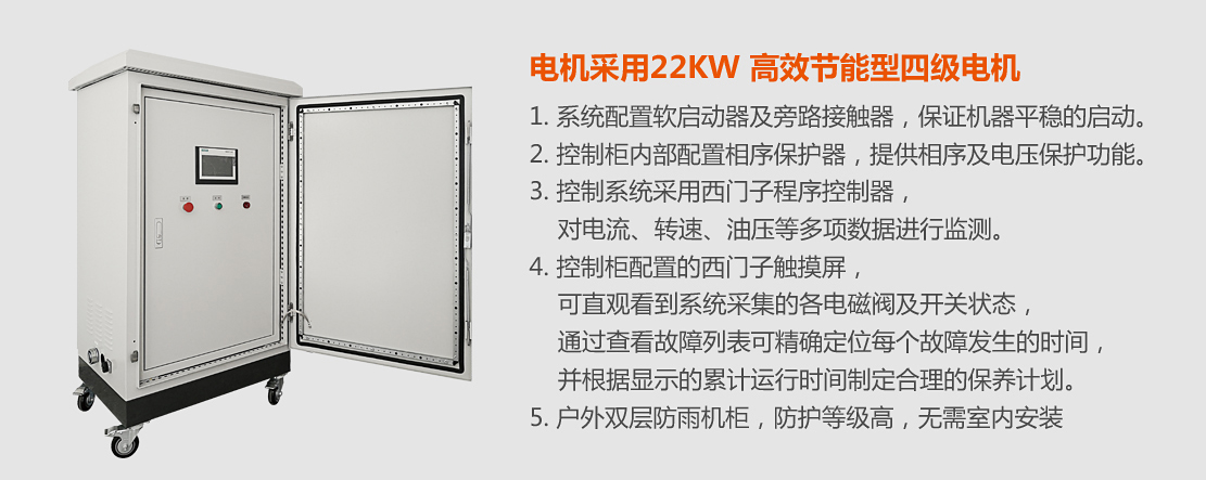 16cm電動(dòng)粉碎機(jī),配置380V22kW高效節(jié)能型電機(jī)。戶外雙層防雨機(jī)柜,防護(hù)等級(jí)高,無需室內(nèi)安裝;配置西門子觸摸屏,可直觀看到系統(tǒng)的運(yùn)行狀況。