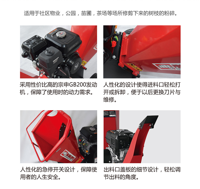 1.整機小巧靈活,適用于社區(qū)物業(yè)、小型公園、苗圃管理、茶場等綠植的碎枝作業(yè)。